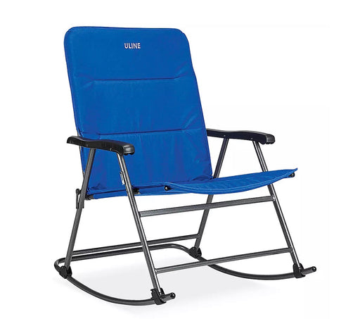 Langley$85.00Blue Uline outdoor rocking chair featuring a 29" wide padded seat and water-resistant fabric. IZ