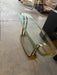 Modern glass console table with sleek metal frame, clear top, and minimalist design for stylish interiors. KS