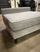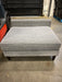 Wide grey fabric ottoman with low back support and dark wooden legs. In great condition. Slightly dirty on bottom from being in-store. TT