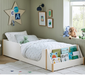Natural wood and white Montessori bed single frame. Features a built-in bookrack at the end of the bed and curved edges. Brand new in box, but parts have not been revised. TT