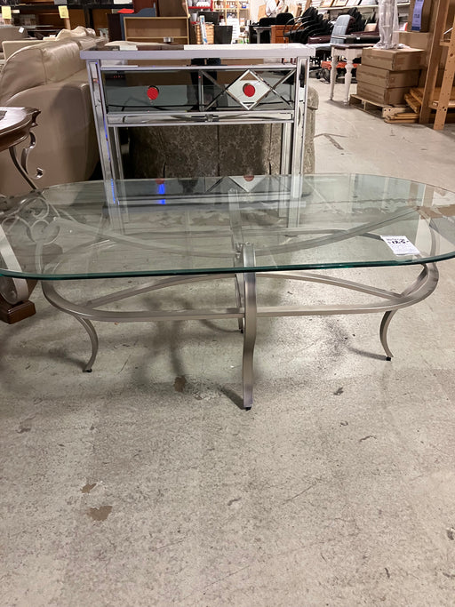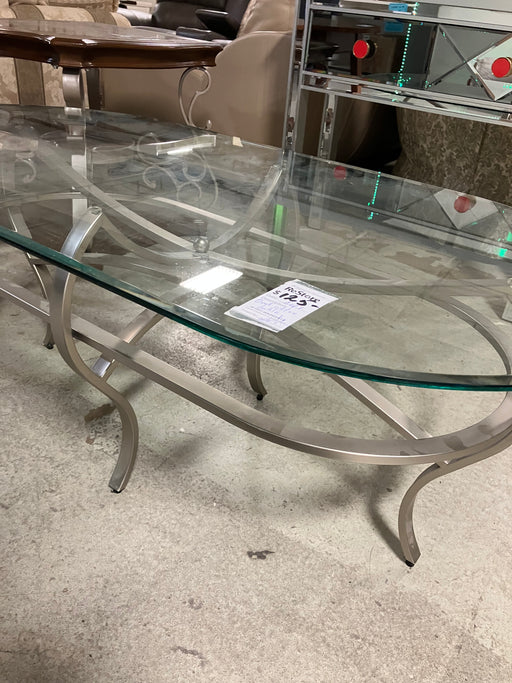 Burnaby Enterprise$40.00Oval glass coffee table with sturdy metal base, modern design, durable construction, perfect centerpiece for living room.
