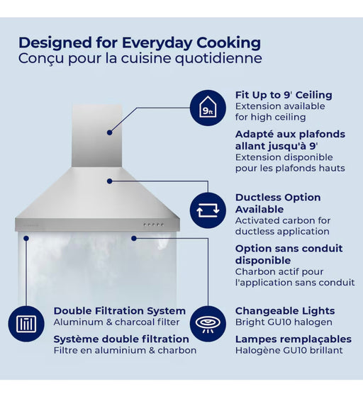 Cosmo 36 in. Vista Collection Ductless Wall Mount Range Hood, Button Controls, Stainless Steel (new)