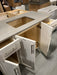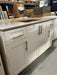 4-piece white vanity with grey/beige (quartz?) countertop. Includes 1 countertop and 3 base cabinets. 2 are 1-door, 1-drawer, and 1 is a 2-door sink cabinet. Used, in great condition. TT