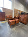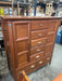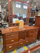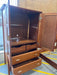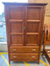 4-piece wooden bedroom set. Bed is queen sized. Features 1 dresser with a vanity mirror, 1 tall dresser, 1 armoire, 1 bed frame, and 2 matching nightstands. Perfect for a starter home! The set is well-loved and has some scuffs/scratches (see photos), but has great opportunity to be refinished and given a fresh, new look. Not as pictured, missing nightstands. TT