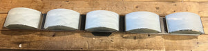 This modern 5 light fixture features patterned glass frosted shades and chrome hardware. Each bulb is a 50 watt 130v minican lamp. Bulbs included. New out of box. Damp rated. J.T